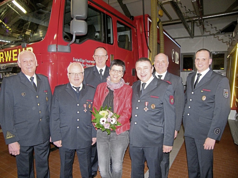 Den Jahresbericht des Fördervereins für den Löschzug Stukenbrock präsentierten mit anschaulichen Fotos Schriftführerin Melina Wulf. Pfarrer Monsignore Wolfgang Bender hatte im Rahmen der Totenehrung an die zu Tode gekommenen Feuerwehrleute erinnert. Beim Sturm »Friederike« volle Leistung gebracht