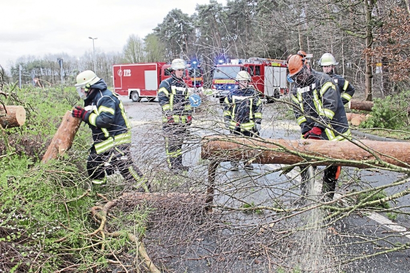 Der Trupp zieht gleich weiter an den Stadtweg. Hier – und bis 14.15 Uhr an 67 anderen Stellen in der Stadt – liegen Bäume umgeknickt wie Streichhölzer quer über den Straßen. Meist begehrtes Werkzeug gestern ist die Kettensäge. Einen Ast, der sich in einem anderen Baum verfangen hatte, holten die Feuerwehrleute runter, damit er niemanden erschlagen kann.
