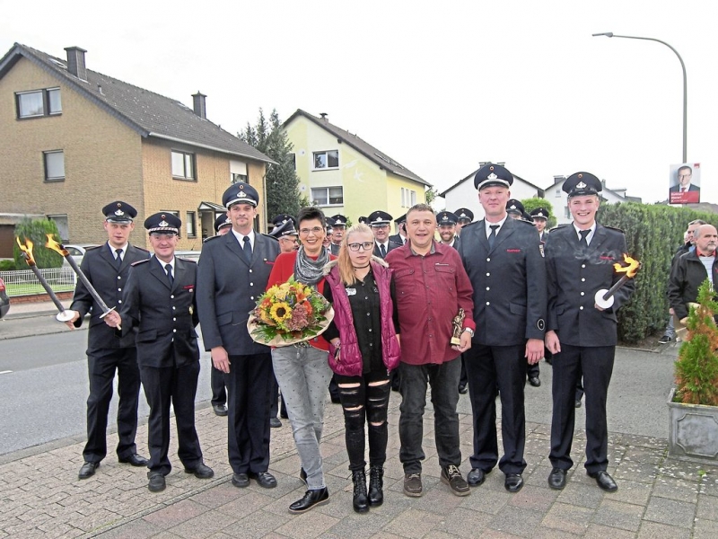 Schloß Holte-Stukenbrock (ibe). Gerald Scharfe, Schriftführer des Fördervereins für den Löschzug Stukenbrock, hat am Samstag sein 25-jähriges Dienstjubiläum gefeiert. Ihm zu Ehren hatten sich rund 30 Kameraden und der Spielmannszug St. Johannes zu einem Fackelzug an der Kreuzung Füchtenweg/Birkenweg getroffen. In Begleitung der Musiker marschierten die Feuerwehrmänner und -frauen zum Haus des Jubilars an der Holter Straße und übergaben ihm