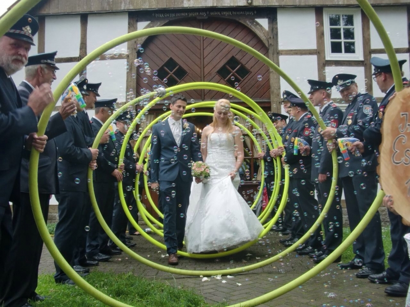 "Daniel Esser (Programmierer, 32) und Iris Budde (Erzieherin, 30) sind beide in der Feuerwehr aktiv und haben sich über die Feuerwehr kennengelernt. Und so haben sie die Kameraden nach der Trauung am Samstag im Heimathaus mit einem Spalier aus C-Schläuchen und bunten Seifenblasen empfangen. Gleich darauf