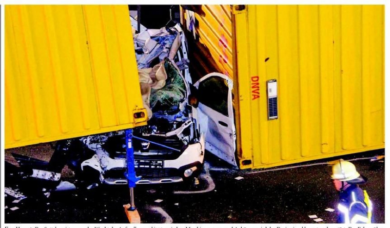 Zu dem Unfall kam es nach Angaben der Bielefelder Polizeisprecherin Kathryn Landwehrmeyer, weil ein 73-jähriger Lkw-Fahrer einer Spedition aus Dassendorf (Schleswig-Holstein) mit seinem Maschinenwagen gegen 21.40 Uhr auf einen auf dem Seitenstreifen stehenden Lkw auffuhr. Der mit zwei Wechselbrücken der Firma "DHL" beladene Lastzug geriet durch den Aufprall in eine Rotationsbewegung und kippte auf die Fahrerseite. Zwischen Maschinenwagen und Anhänger wurde der Dacia von den Containern zerdrückt und eingeklemmt.