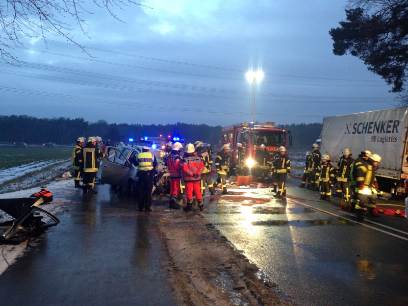 Der Lkw-Fahrer und der Fahrer des Dacia erlitten schwere Verletzungen. Das Ehepaar war auf der Rückfahrt von Wilhelmshafen nach Hause, als es etwa 120 Kilometer vor dem Ziel zu dem Unfall kam. Der Mann konnte mit etwas Hilfe noch selbst aus dem Wrack steigen.